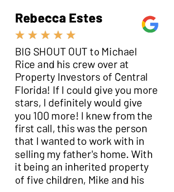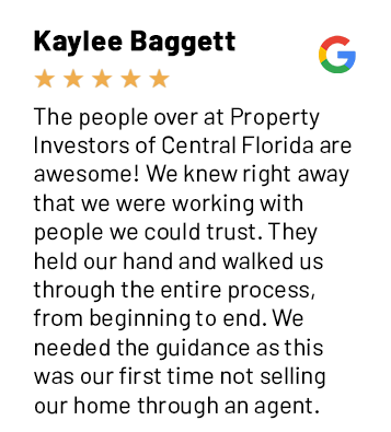 Property Investors of Central Florida is a Real Estate Investment company. We are a local family-owned company and we help homeowners sell their homes quickly and without hassle. We pay cash for the houses and buy them in as-is condition. We offer a wide variety of solutions to any real estate problem. We will visit your home for a free 5 minute walk-through, and then make a fair, market-based offer.